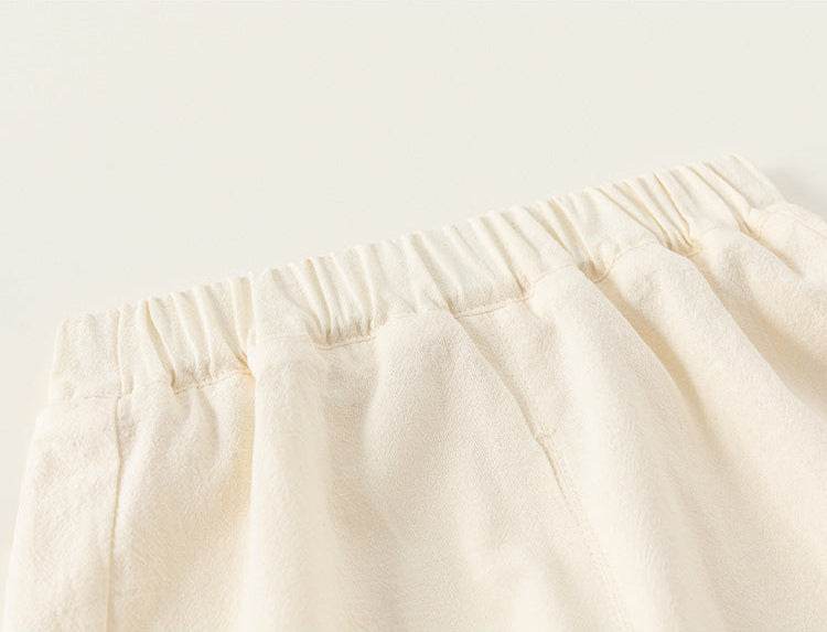 A stylish boys’ Chinese-style outfit featuring a lotus ink-wash mandarin-collar shirt with classic frog buttons, paired with solid-coloured traditional shorts — comfortable, cultural, and perfect for festive occasions or photoshoots.