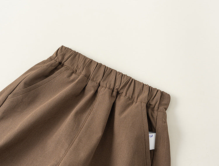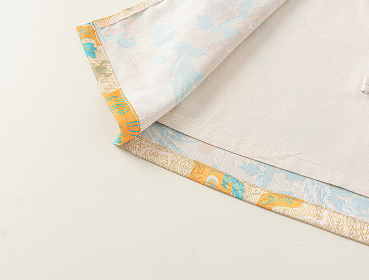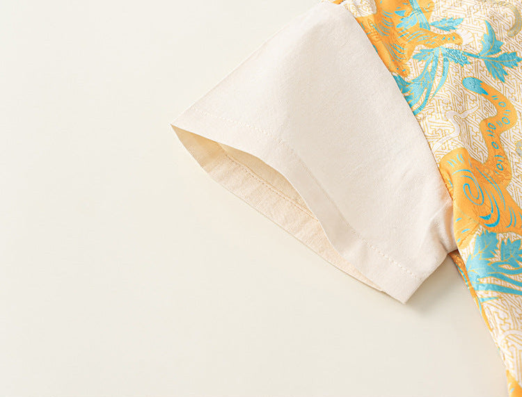 A stylish boys’ Chinese-style outfit featuring a tiger print mandarin-collar shirt with classic frog buttons, paired with solid-coloured traditional shorts — comfortable, cultural, and perfect for festive occasions or photoshoots.